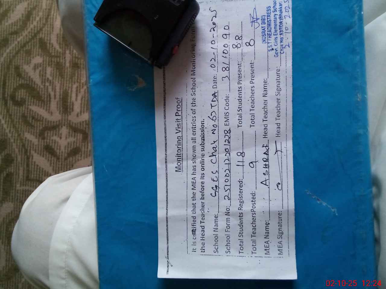 | Attendance Register | Head Teacher | MEA with School | Visit Proof |