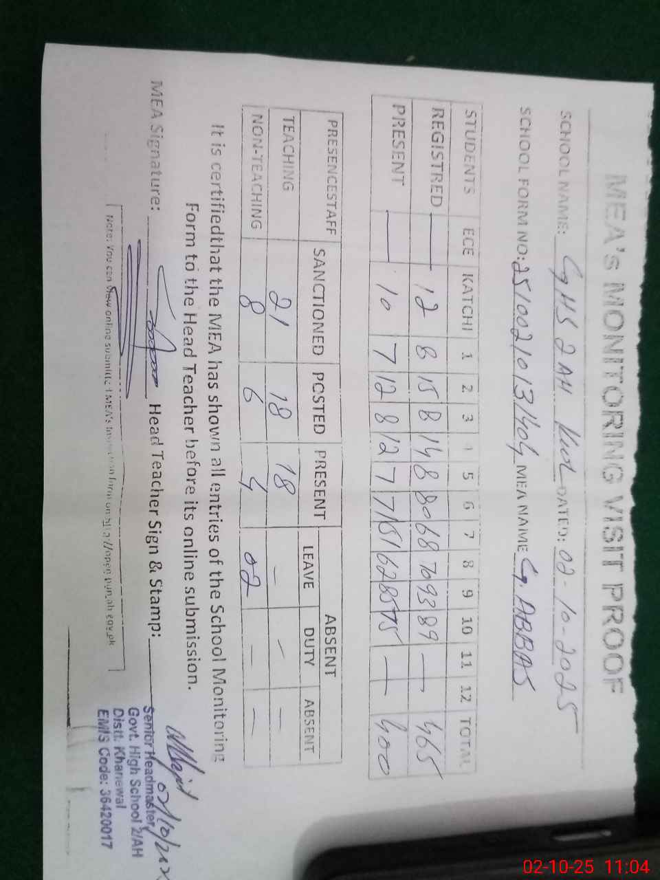 | Attendance Register | Head Teacher | MEA with School | Visit Proof |