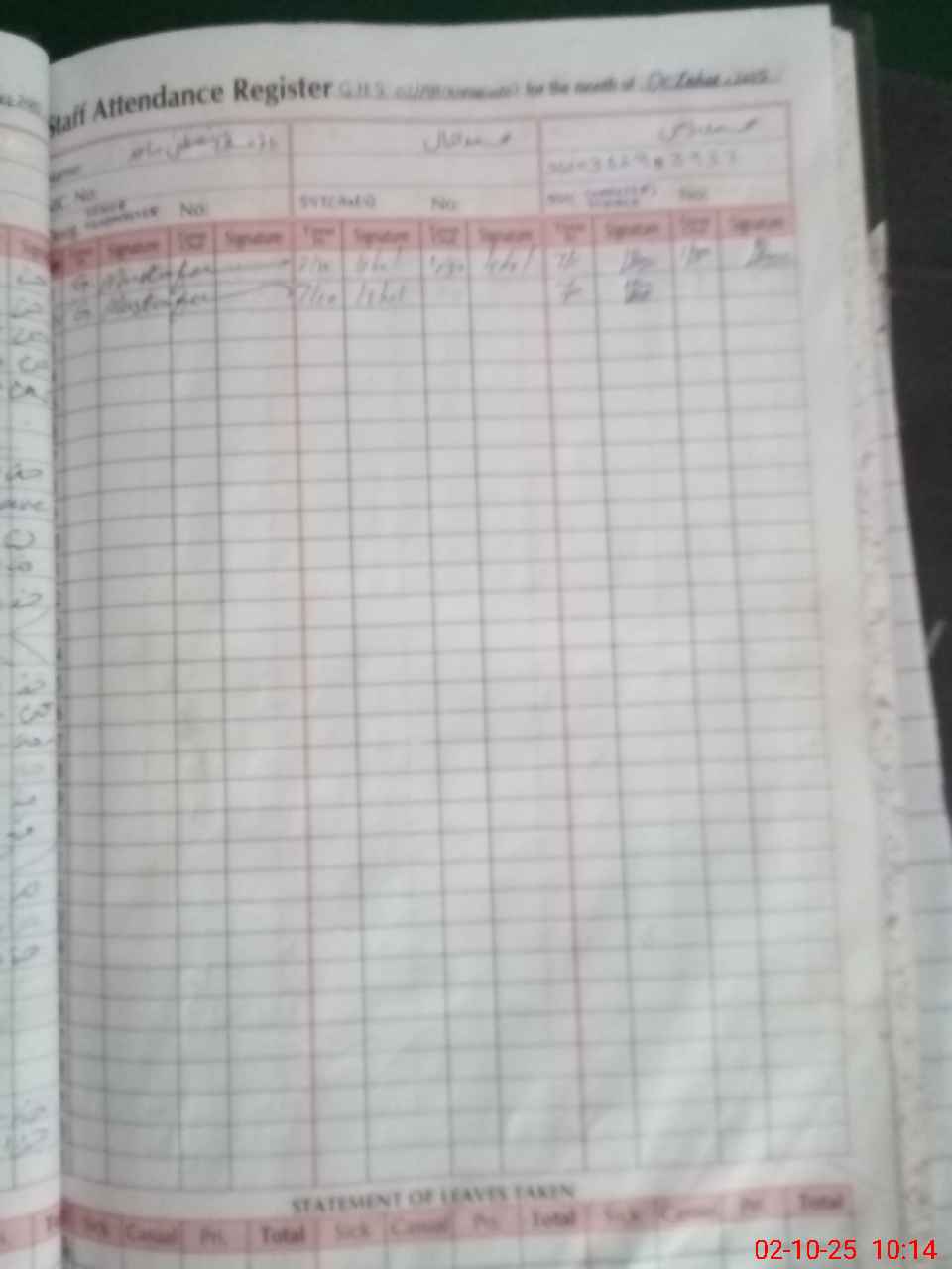 | CNIC | Full Name | Designation | R/C | Absence During Last Calender Month |