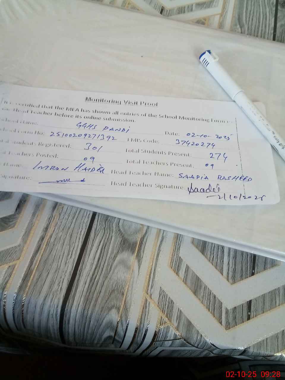 | Certified that this School was Inspected by the Undersigned MEA/DMO Today and the Information Stated Above is as Per Record. | |||||