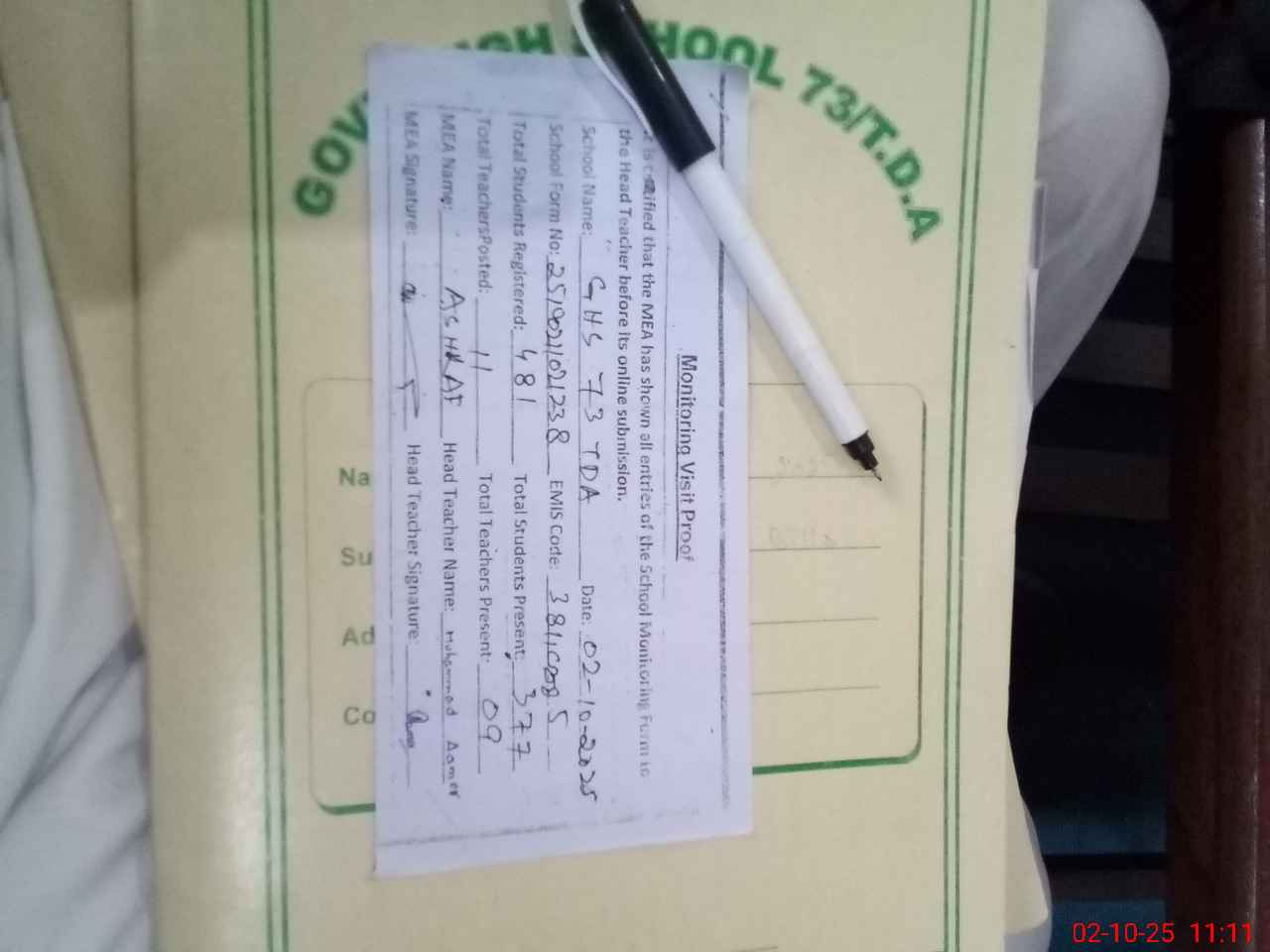| Attendance Register | Head Teacher | MEA with School | Visit Proof |