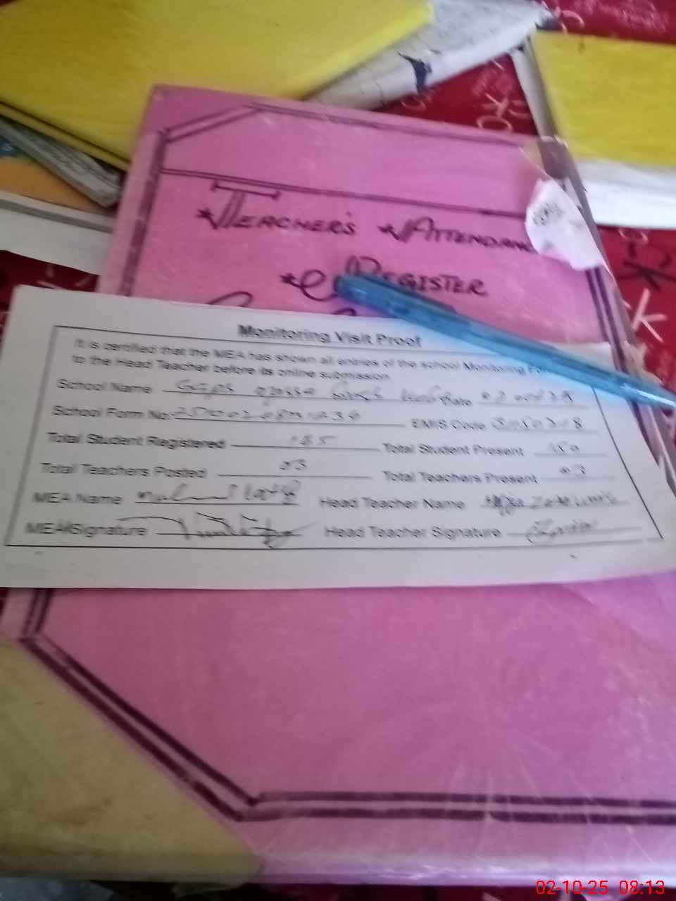 | Attendance Register | Head Teacher | MEA with School | Visit Proof |