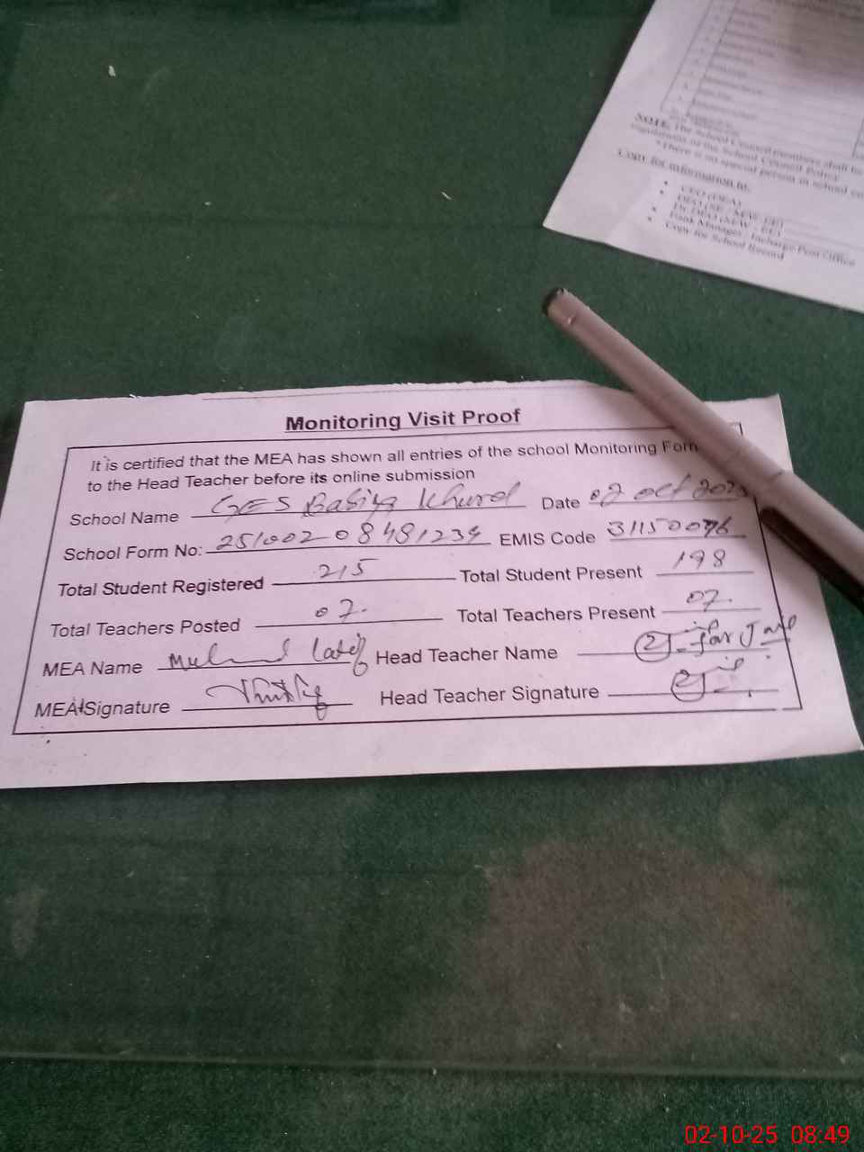 | Certified that this School was Inspected by the Undersigned MEA/DMO Today and the Information Stated Above is as Per Record. | |||||