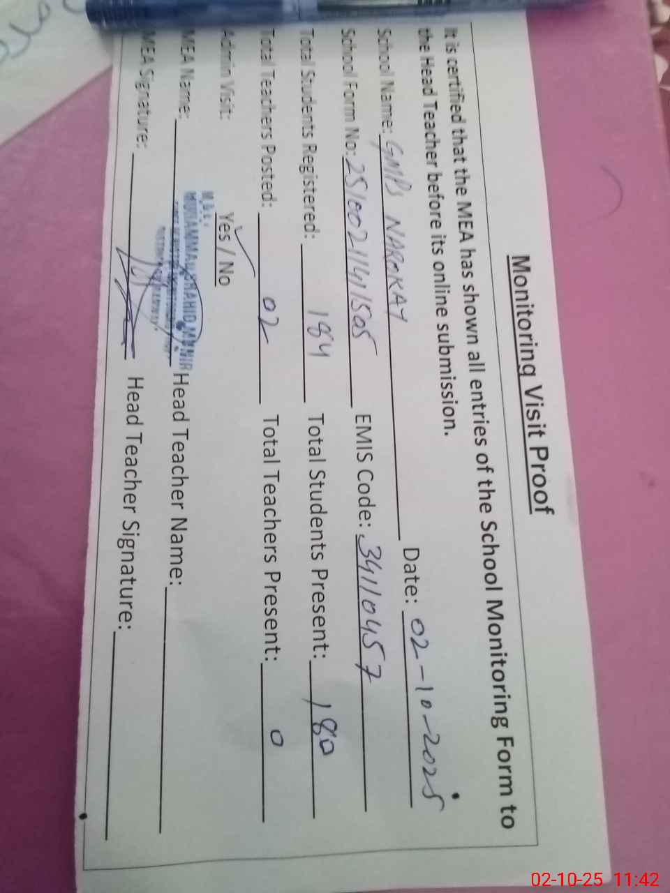 | Attendance Register | Head Teacher | MEA with School | Visit Proof |