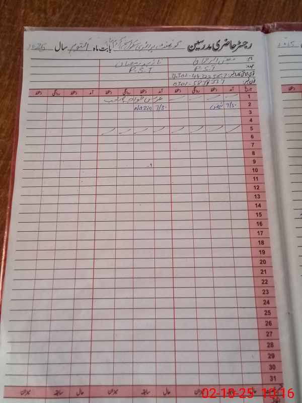 | Name: FA**** URRE**** Designation: (School Headmaster's/Headmistress's) PST/PTC/JV Phone/Cell Number: 03**** |