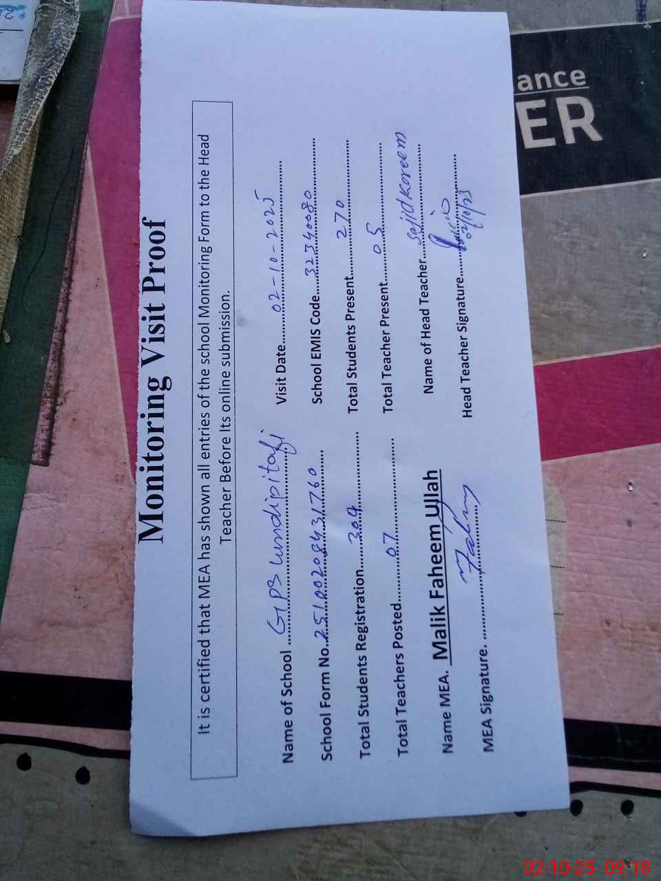 | Certified that this School was Inspected by the Undersigned MEA/DMO Today and the Information Stated Above is as Per Record. | |||||