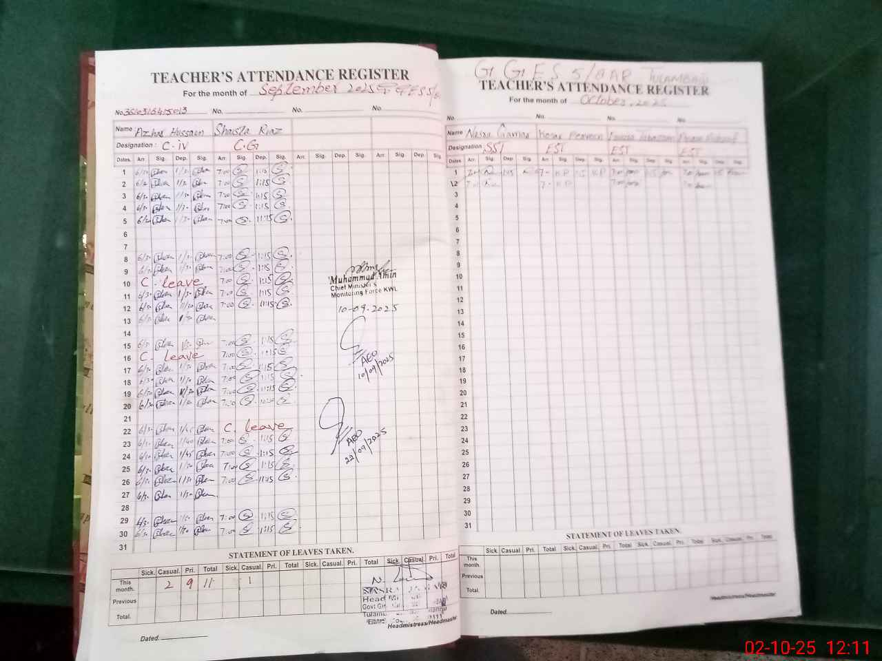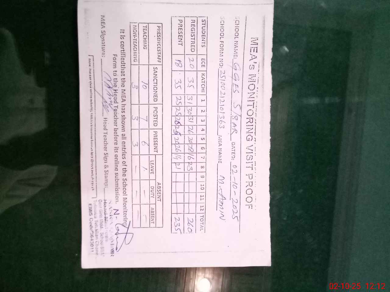 | Attendance Register | Head Teacher | MEA with School | Visit Proof |