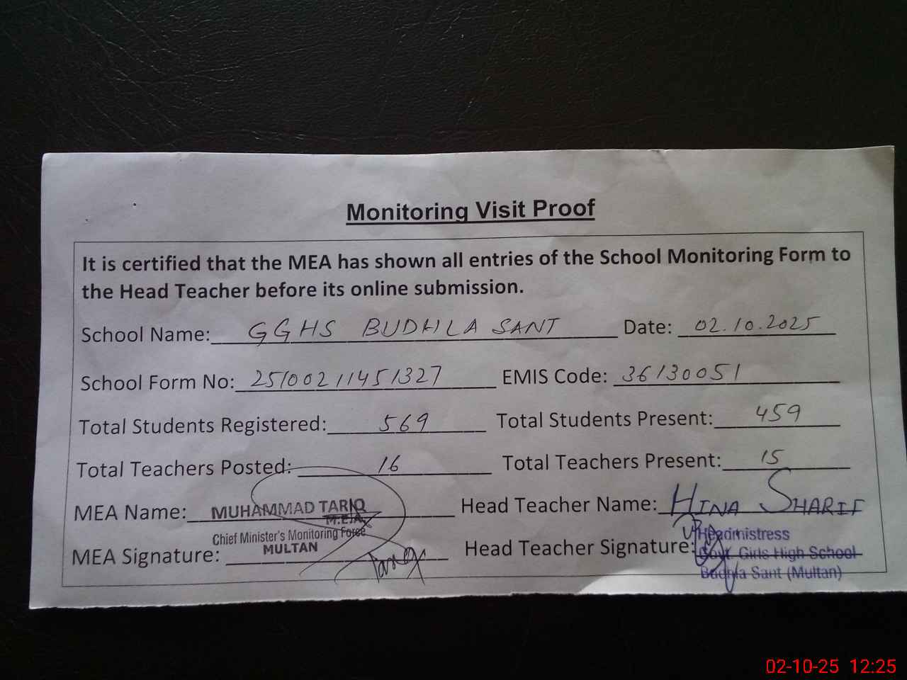 | Certified that this School was Inspected by the Undersigned MEA/DMO Today and the Information Stated Above is as Per Record. | |||||