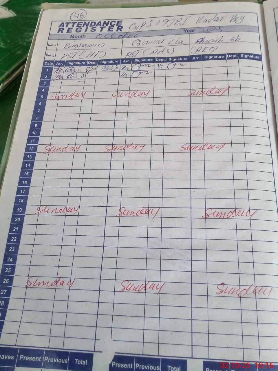 | CNIC | Full Name | Designation | R/C | Absence During Last Calender Month |