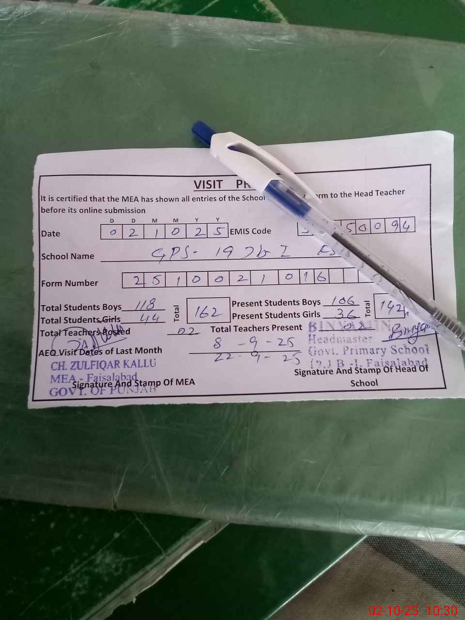 | Certified that this School was Inspected by the Undersigned MEA/DMO Today and the Information Stated Above is as Per Record. | |||||