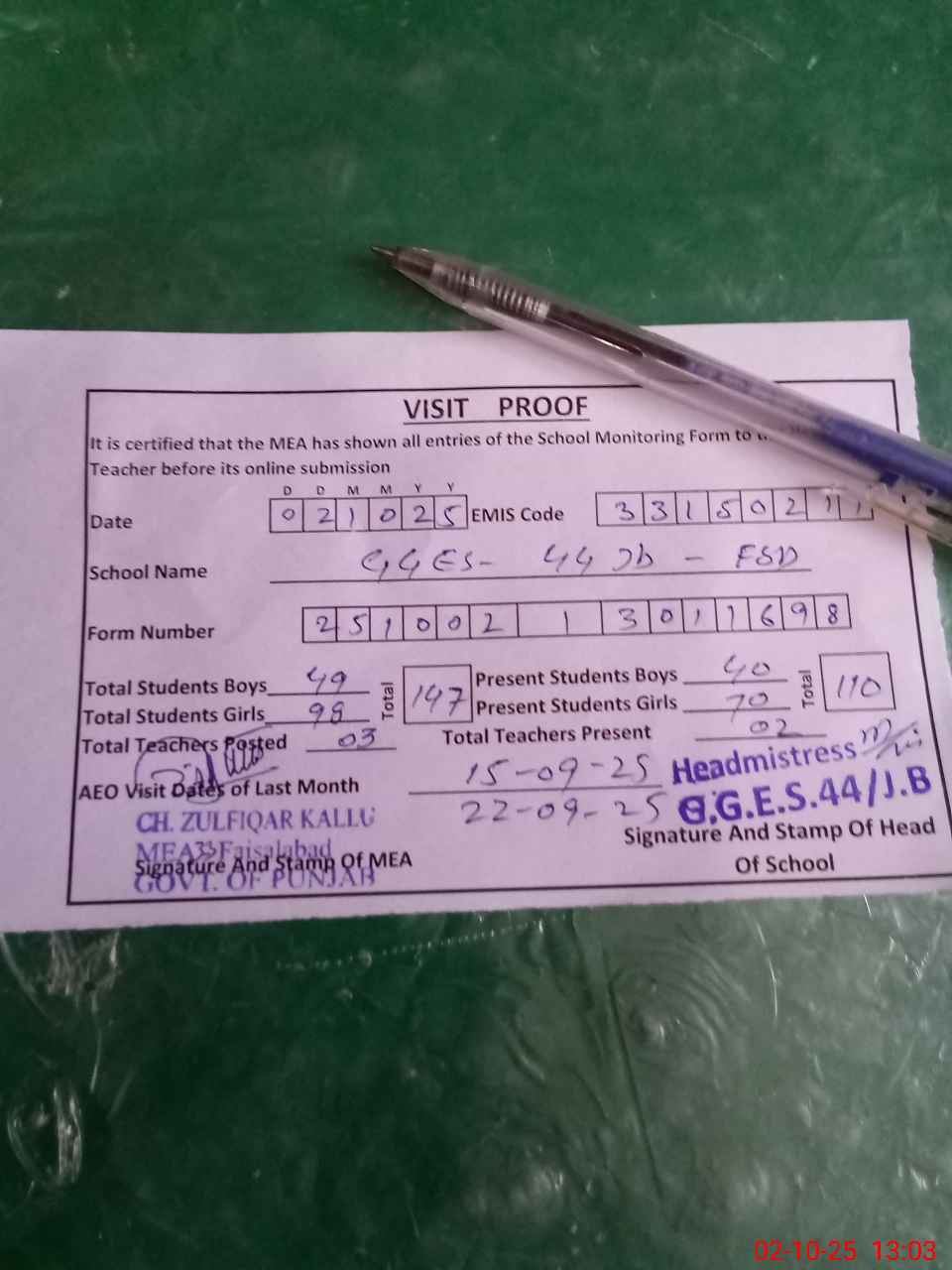 | EMIS Code: 33150211 | Name of School: GGES CHAK NO 44 JB PAKKADHLA | |||