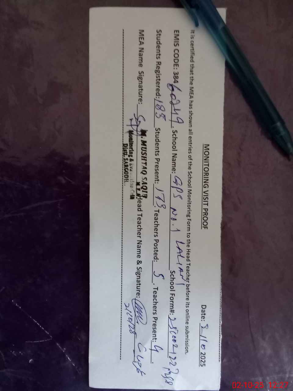 | EMIS Code: 38460249 | Name of School: GPS NO.1 LALYANI | |||
