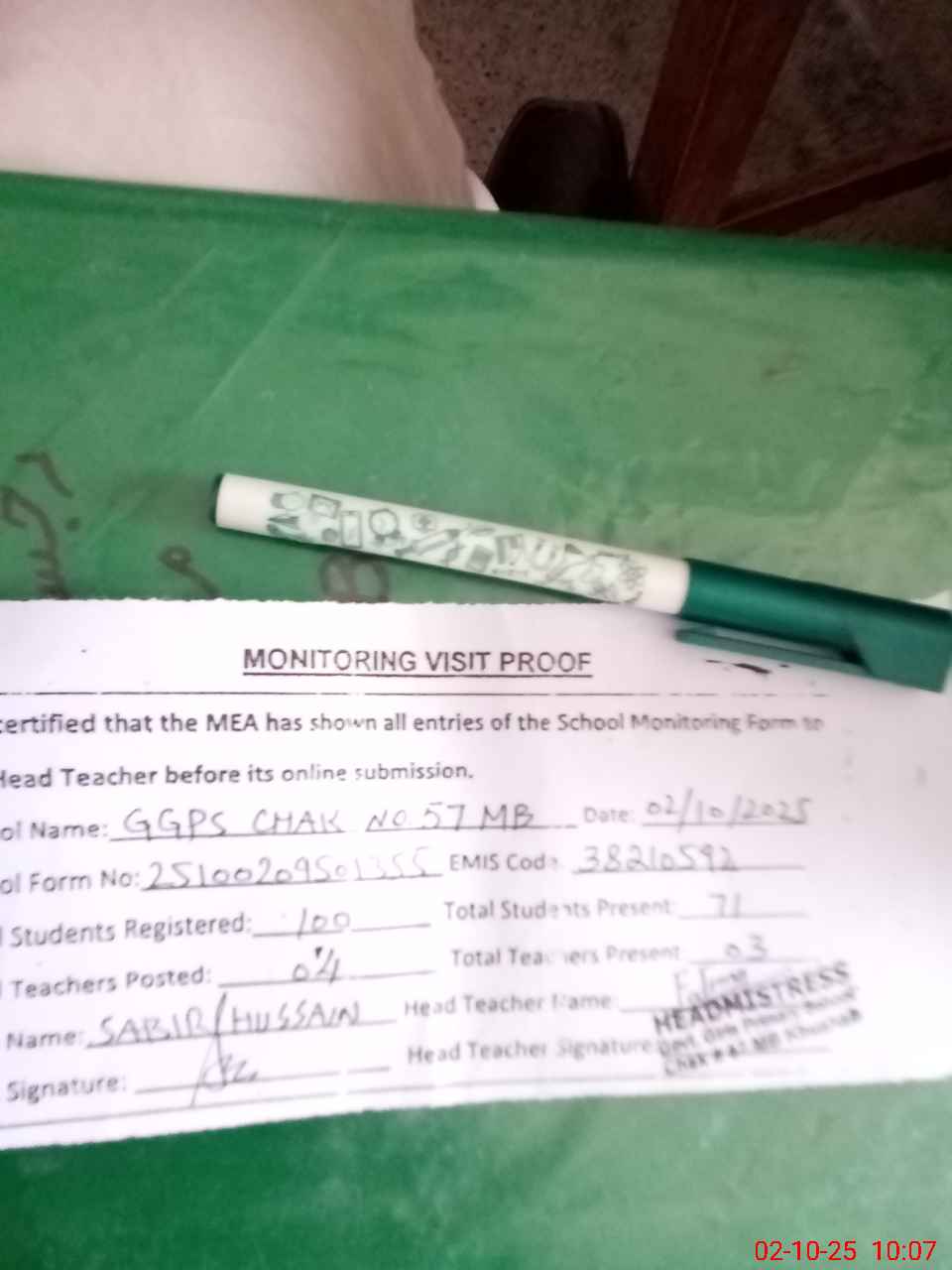 | EMIS Code: 38210592 | Name of School: GGPS CHAK NO. 57 MB | |||