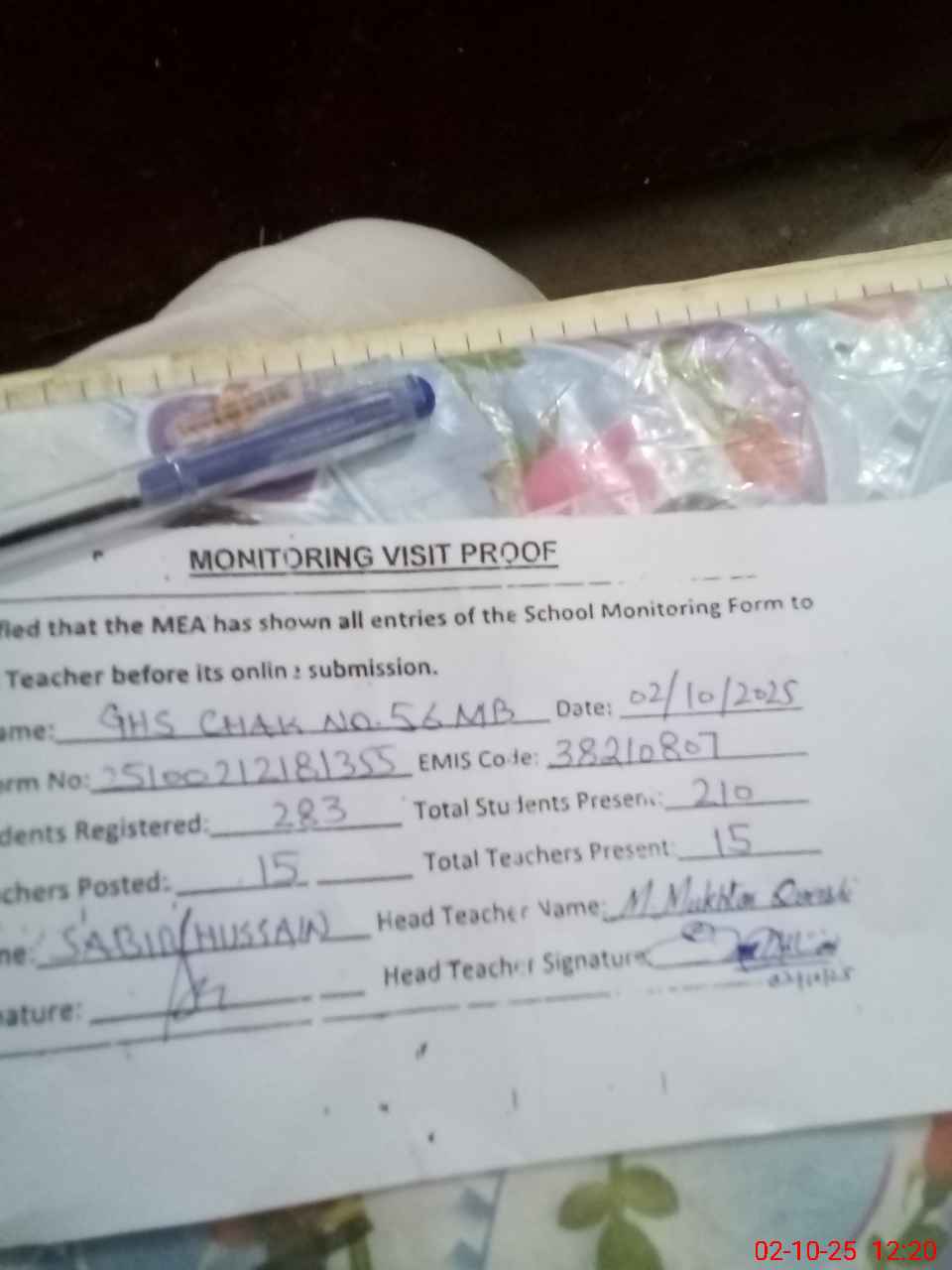 | EMIS Code: 38210807 | Name of School: GHS CHAK NO. 56 MB | |||