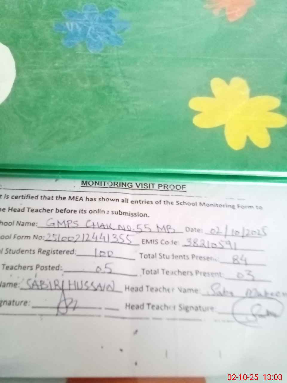 | EMIS Code: 38210591 | Name of School: GMPS CHAK NO. 55 MB | |||