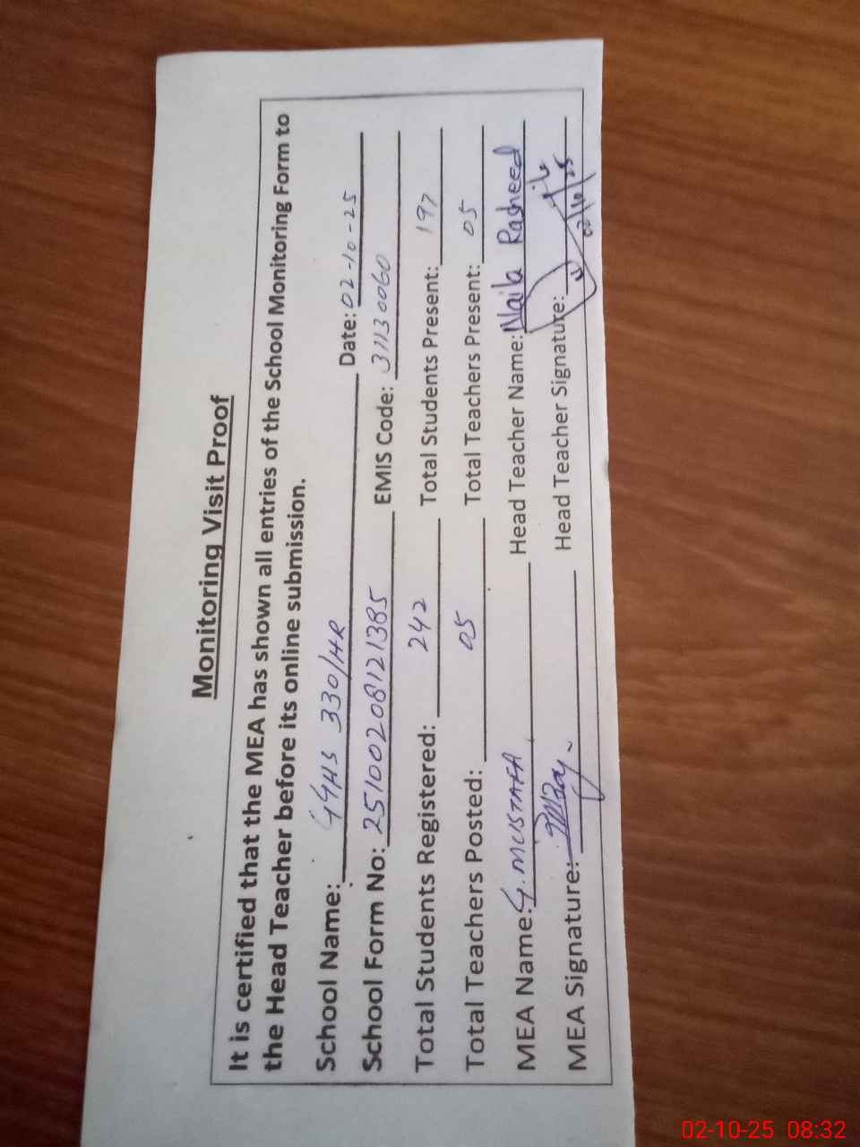 | Attendance Register | Head Teacher | MEA with School | Visit Proof |