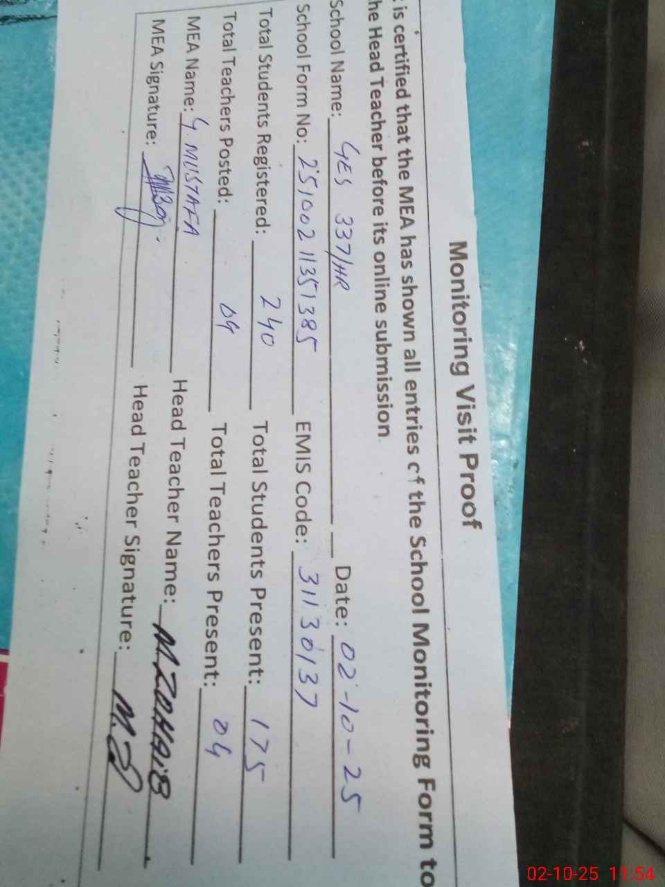 | Attendance Register | Head Teacher | MEA with School | Visit Proof |