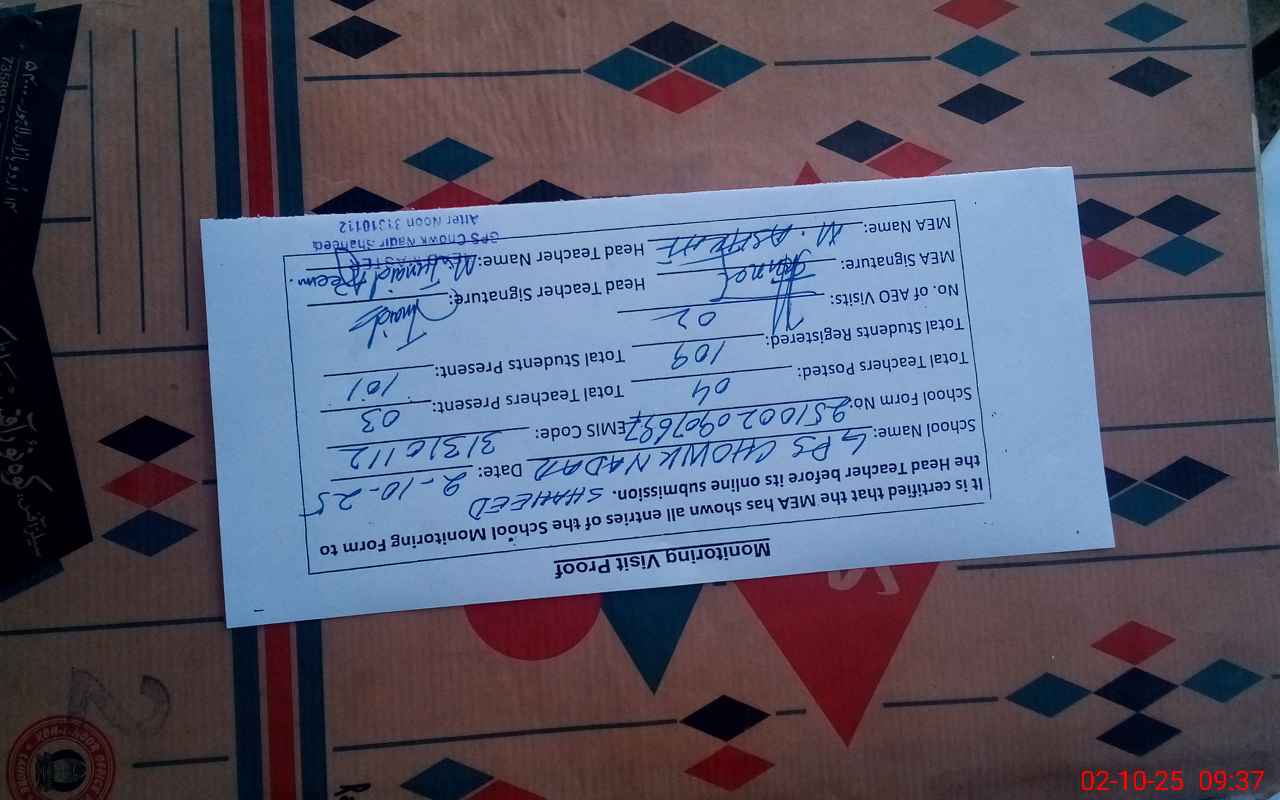 | EMIS Code: 31310112 | Name of School: GPS CHOWK NADIR SHAHEED (After Noon) | |||