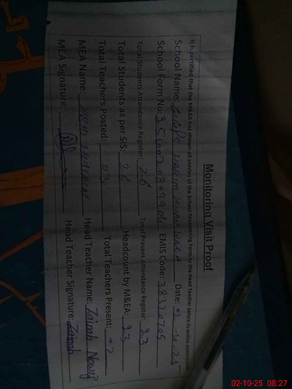 | Attendance Register | Head Teacher | MEA with School | Visit Proof |
