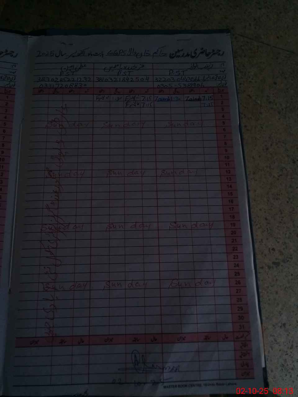| CNIC | Full Name | Designation | R/C | Absence During Last Calender Month |