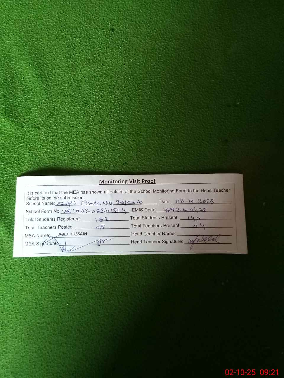 | Attendance Register | Head Teacher | MEA with School | Visit Proof |