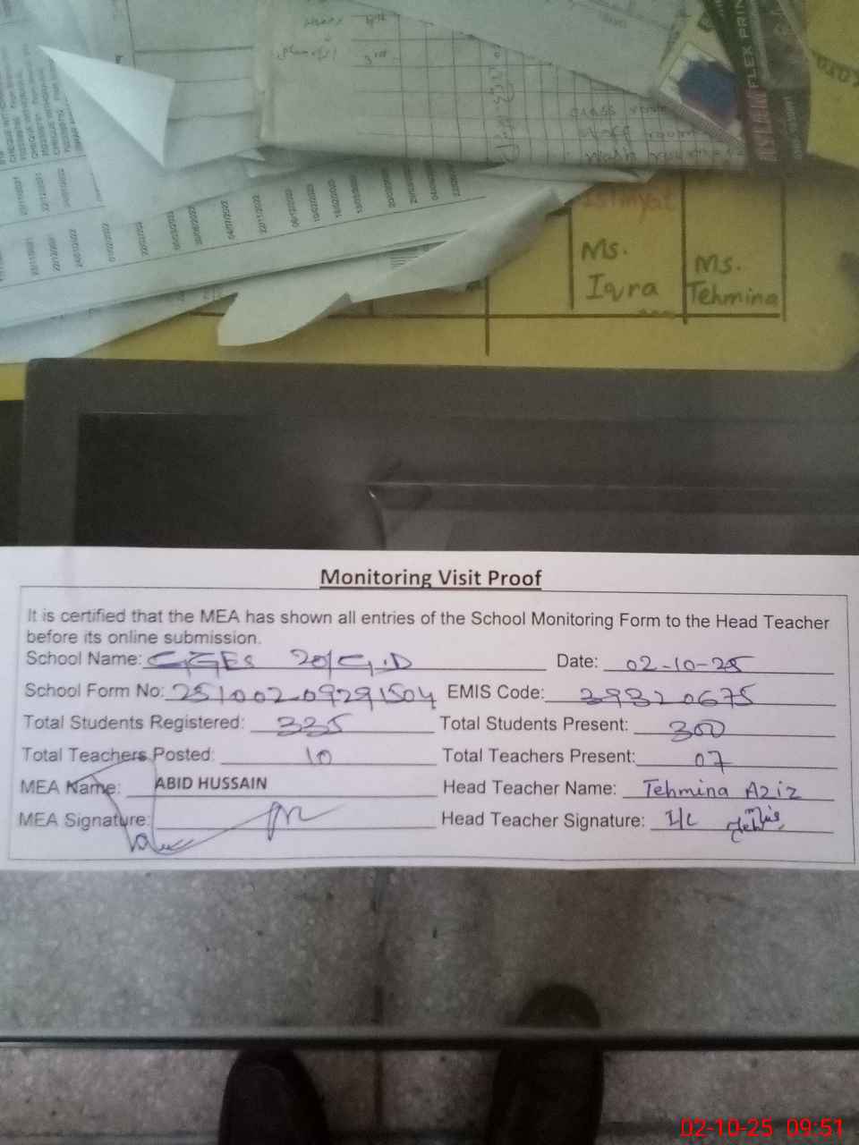 | Attendance Register | Head Teacher | MEA with School | Visit Proof |