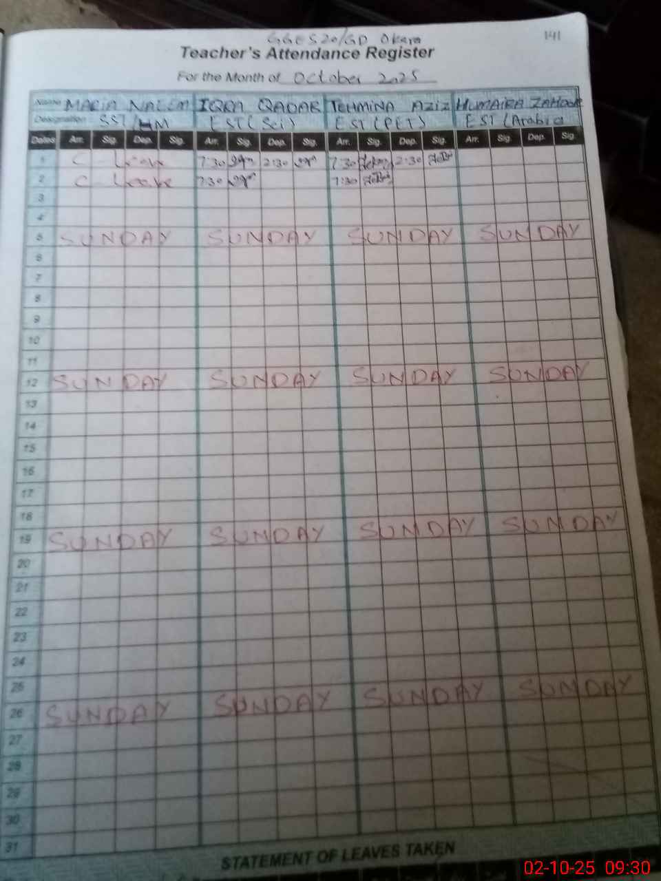 | 35**** | Hu**** Za**** | Regular | 0 | 0 | 30 | 0 | 0 | 0 | 0 | 0 | 0 | Absent (Un-Authorized) | |