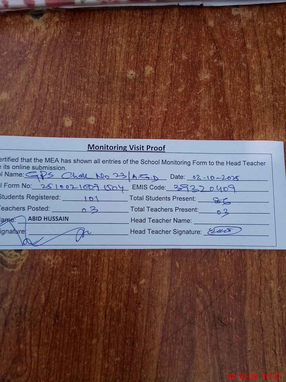 | EMIS Code: 39320409 | Name of School: GPS CHAK NO. 23-A/G.D | |||