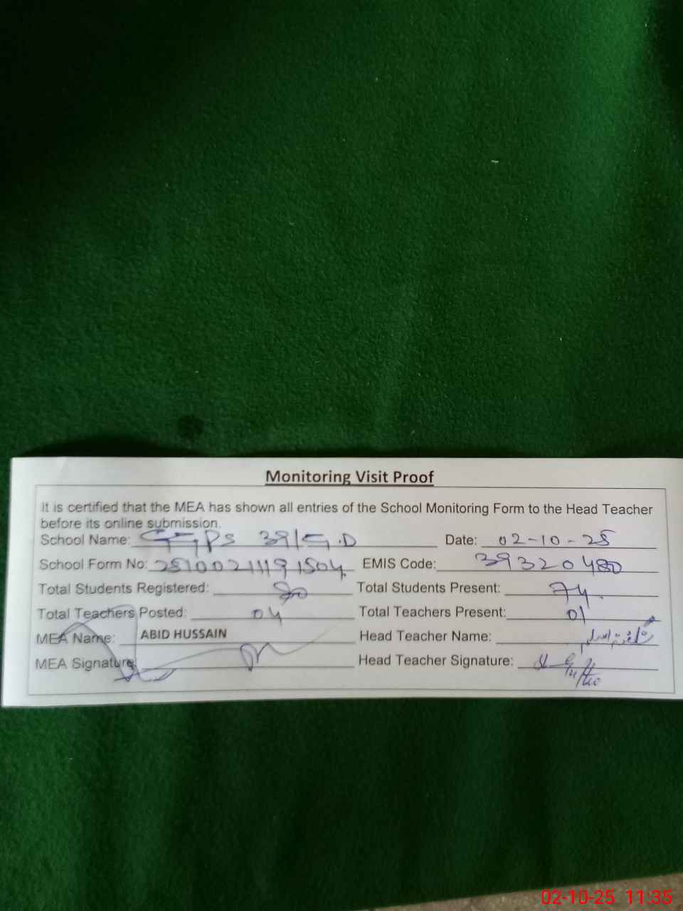 | Remarks (Use Separate Page if Required): NSB and FTF record not available with incharge head due to Head Teacher is on leave | |||||
