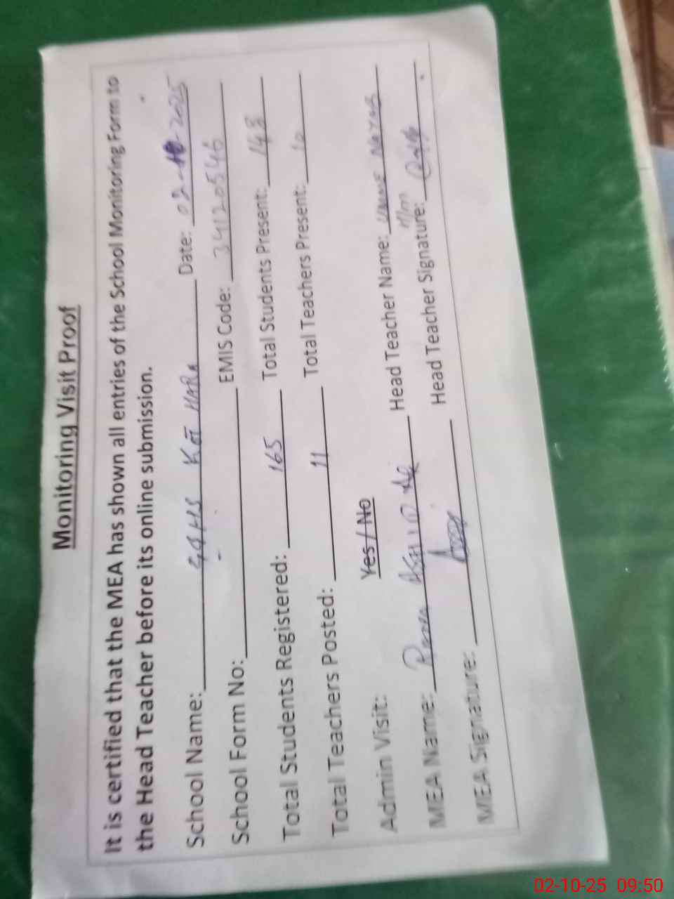 | Attendance Register | Head Teacher | MEA with School | Visit Proof |