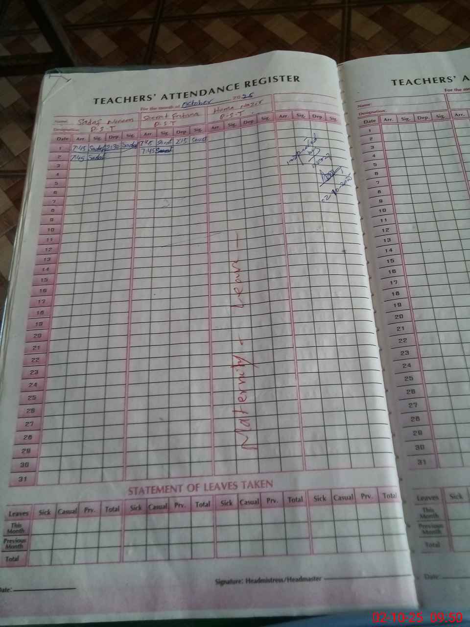 | 34**** | Hu**** Na**** | PST | Regular | 0 | 0 | 0 | 0 | 0 | 0 | 0 | 0 | 0 | Maternity |