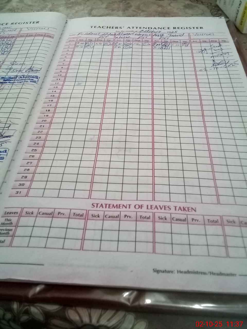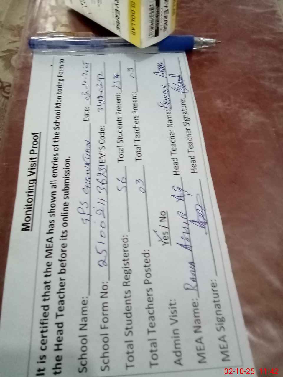 | Attendance Register | Head Teacher | MEA with School | Visit Proof |