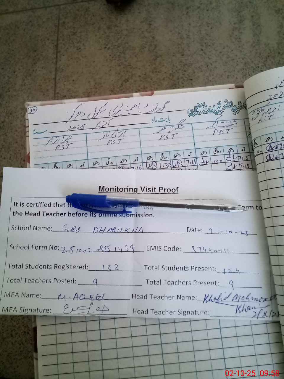 | Attendance Register | Head Teacher | MEA with School | Visit Proof |