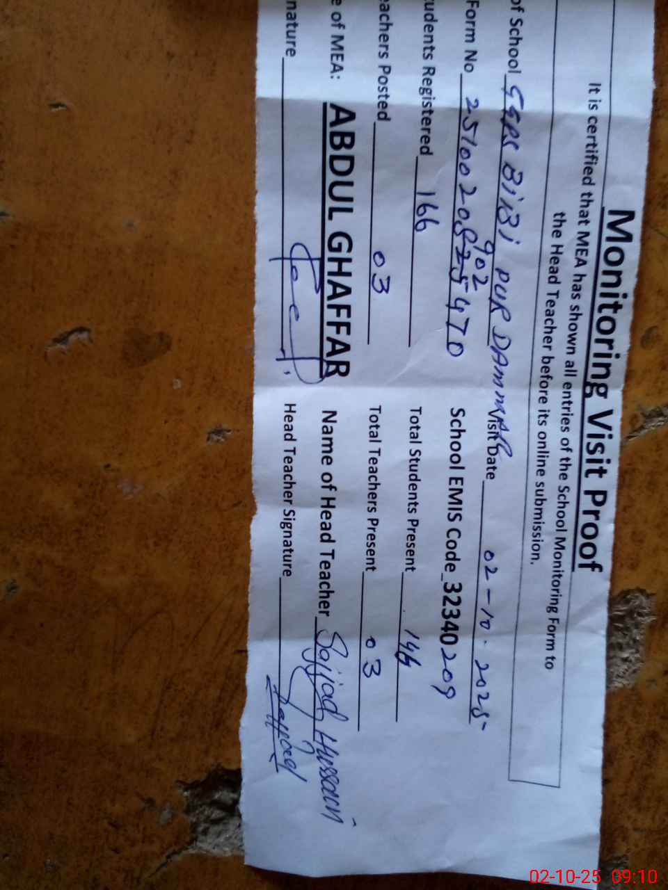 | Attendance Register | Head Teacher | MEA with School | Visit Proof |