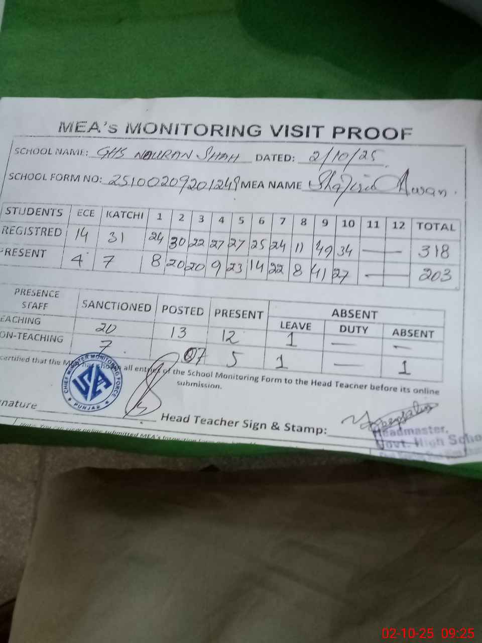 | Attendance Register | Head Teacher | MEA with School | Visit Proof |