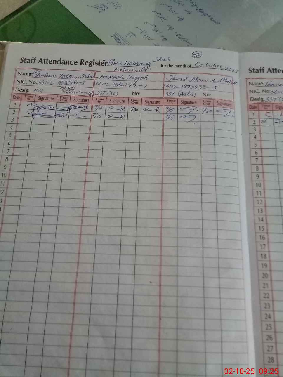 | CNIC | Full Name | Designation | R/C | Absence during last cal. month |
