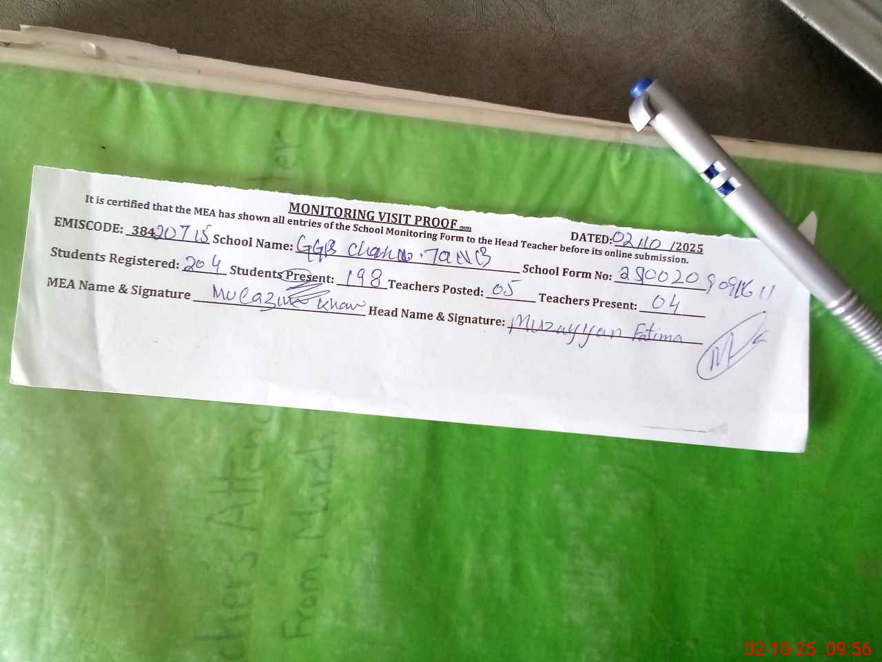 | Attendance Register | Head Teacher | MEA with School | Visit Proof |