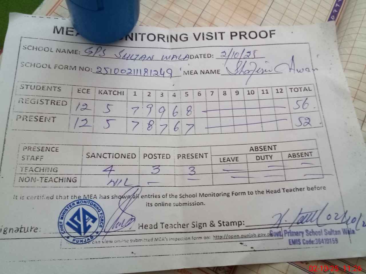 | Attendance Register | Head Teacher | MEA with School | Visit Proof |