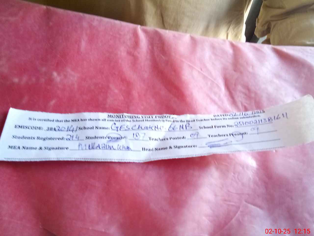 | Attendance Register | Head Teacher | MEA with School | Visit Proof |
