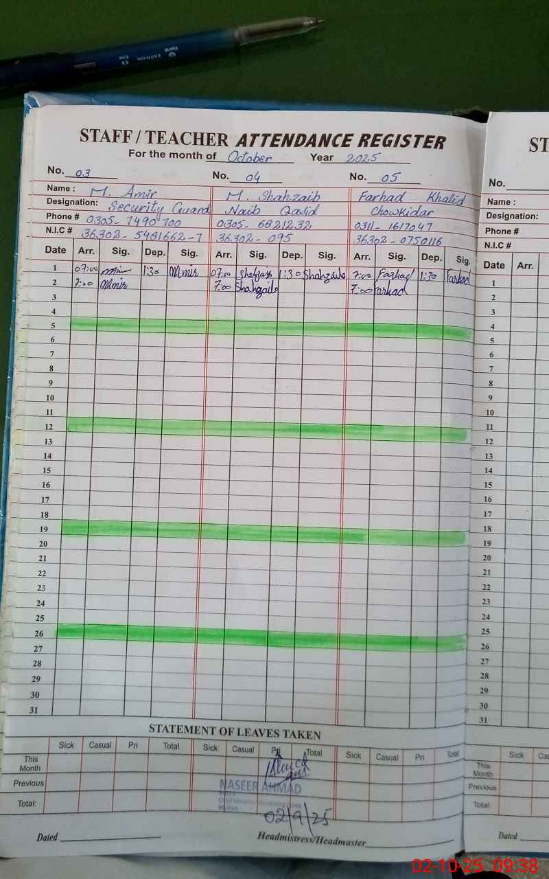 | CNIC | Full Name | Designation | R/C | Absence During Last Calender Month |