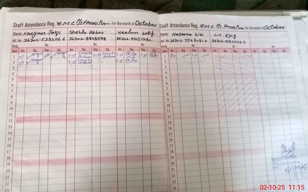 | CNIC | Full Name | Designation | R/C | Absence During Last Calender Month |