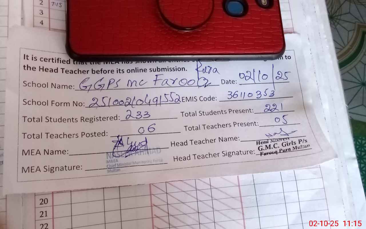 | EMIS Code: 36110353 | Name of School: GGPS MC FAROOQ PURA MULTAN | |||