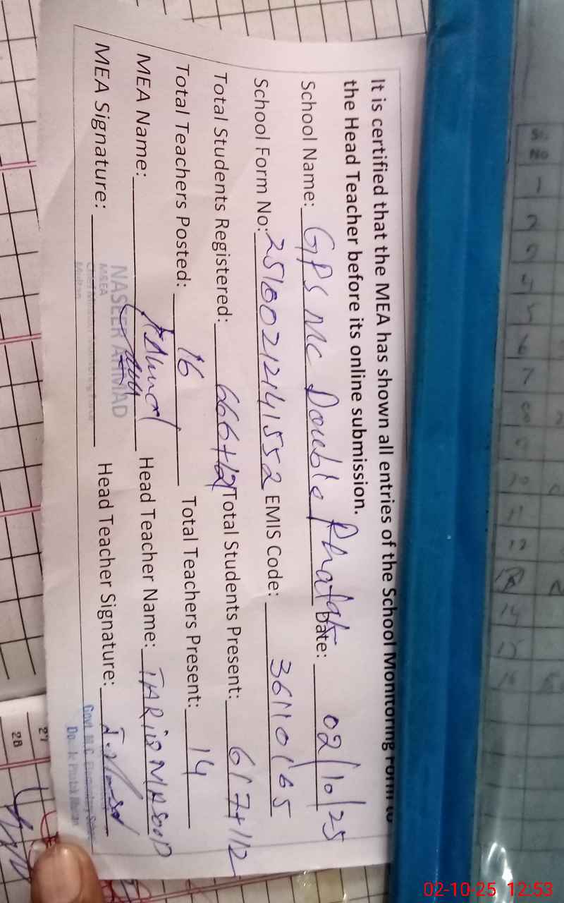| EMIS Code: 36110165 | Name of School: GPS MC DOUBLE PHATAK VEHARI ROAD MULTAN | |||