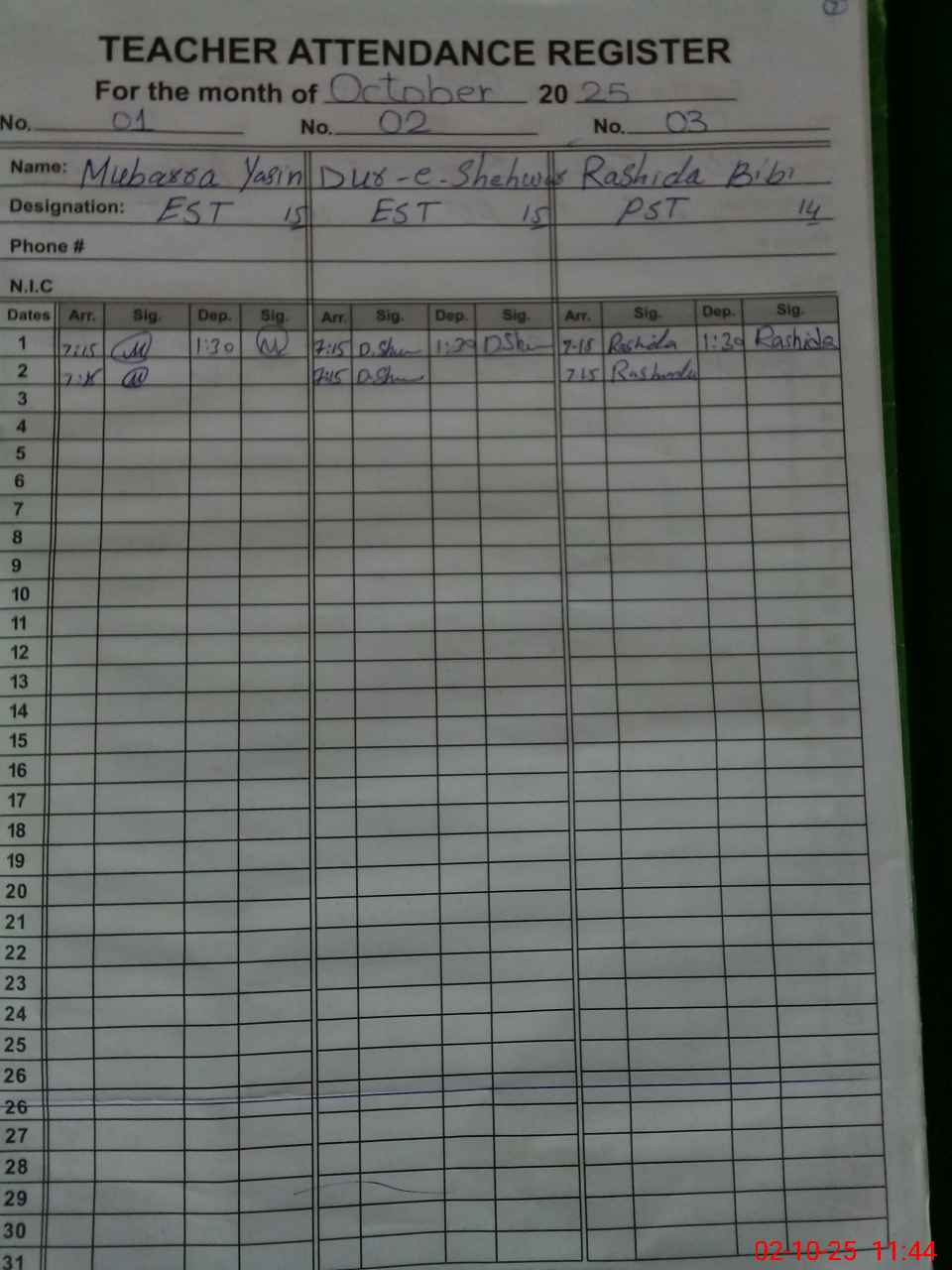 | CNIC | Full Name | Designation | R/C | Absence During Last Calender Month |