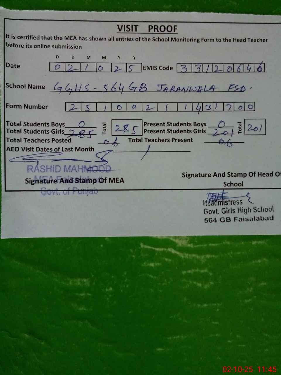 | Certified that this School was Inspected by the Undersigned MEA/DMO Today and the Information Stated Above is as Per Record. | |||||