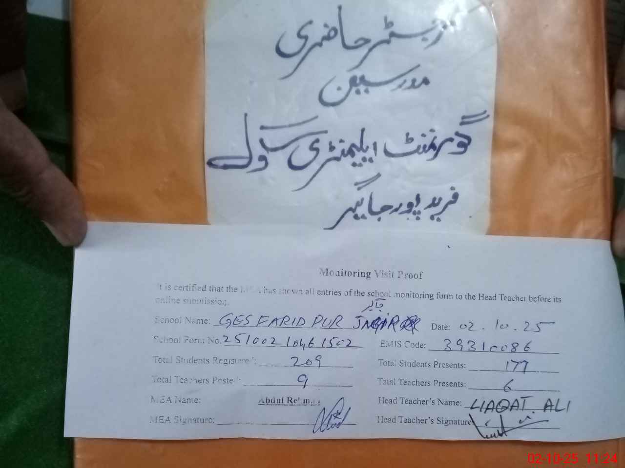 | Attendance Register | Head Teacher | MEA with School | Visit Proof |