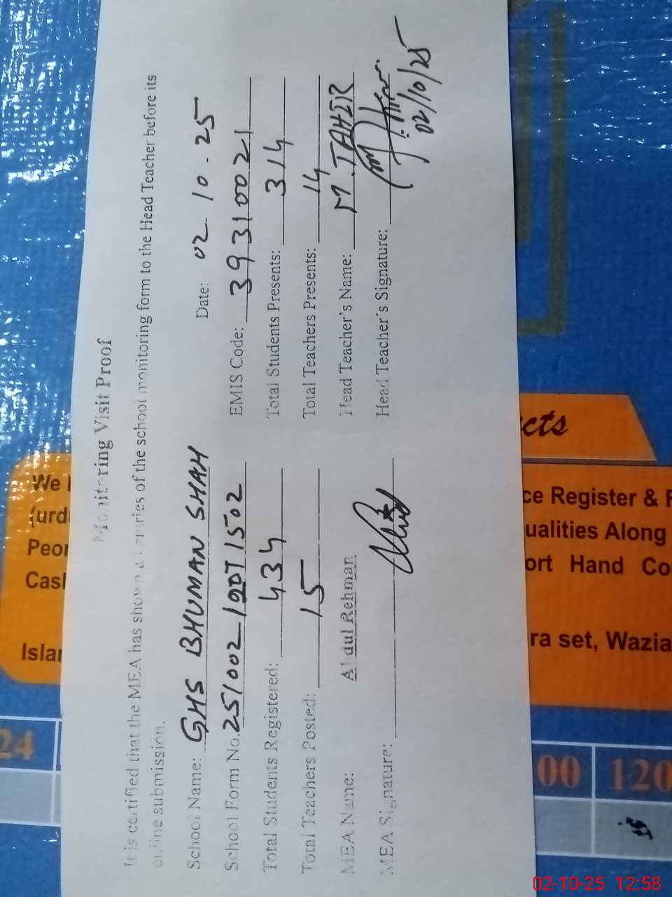 | Attendance Register | Head Teacher | MEA with School | Visit Proof |