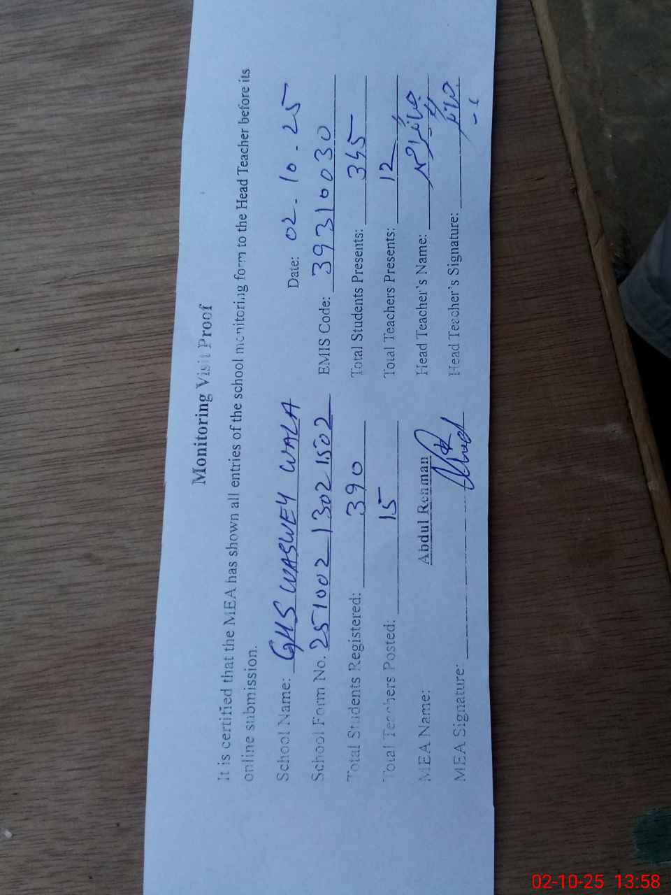| Attendance Register | Head Teacher | MEA with School | Visit Proof |
