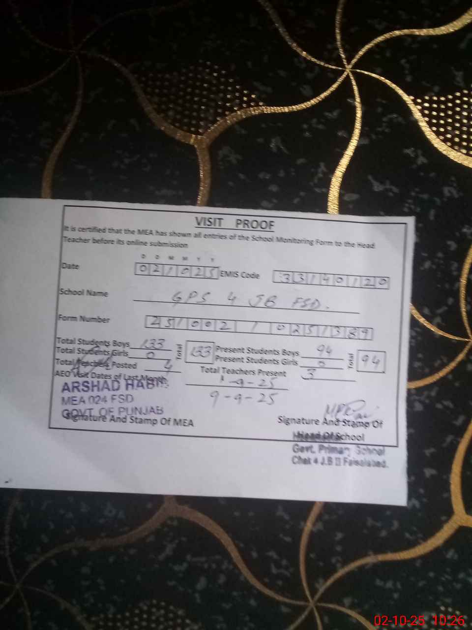 | Certified that this School was Inspected by the Undersigned MEA/DMO Today and the Information Stated Above is as Per Record. | |||||