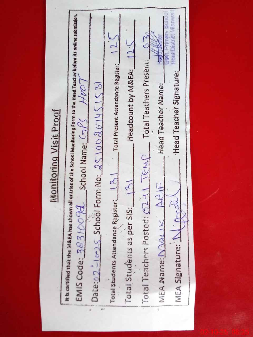 | Attendance Register | Head Teacher | MEA with School | Visit Proof |